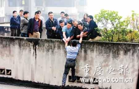 时间一分一秒过去,周周哭喊了将近两小时。“我不跳楼了。”9时许,被儿子哭声警醒的严某,突然号啕大哭,双脚从楼顶边缘缩了回来后,向民警靠近。两民警趁机上前,将其抓获。