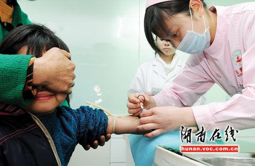 长沙市某医院,遭老师侵犯的8岁女童玲玲正在做血常规检查 (记者伍霞摄)