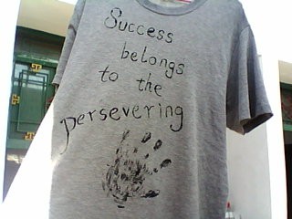 回家后儿子给我看了作品,我让他用水试验了一把,结果证明不掉色,很成功,所以他很高兴,我也为他高兴,自己的愿望实现,以后可以继续。就像儿子写的字一样,坚持就是胜利,希望儿子能做到这一点,永不言败。