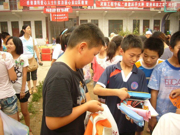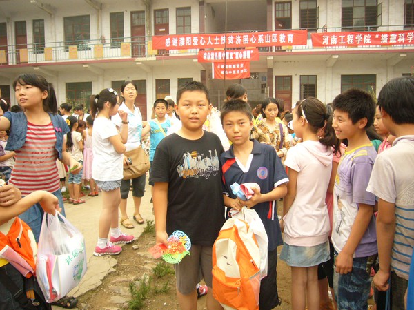 到了登封,沿着曲曲弯弯坎坷不平的小路行驶了好远,才来到我们期望已久的小学,孩子们拿着自己的礼物排队列入,我则和其他义工一起把大捆的书和大包的衣服抬进校园,天刚下过雨,路面有些泥泞,不像城市里到处都是水泥或柏油地面;进了校园,虽然看到了一座两层教学楼,但窗户、桌椅和宿舍都很简陋;孩子们正在进行期末考试颁奖仪式,大家整整齐齐的列队站在校园里,但身上的衣服却不像队伍整齐,有点脏,有点皱,更主要的是旧。学校的孩子们看到我们的到来异常的开心,在找朋友交流的时候,儿子环视了一下四周,找准了一个拿着奖状的孩子,走到他跟前说:“你好,很高兴能认识你,我叫李明泽。”那个孩子虽有些羞涩,但也很懂礼貌,也跟儿子道好。儿子像个小大人一样问了新朋友关于生活、学习方面的问题,就把书包给了朋友,然后把袋子里的笔、本、跳绳一个个地拿出来放到朋友的怀里。只见这时,周围又有几个孩子围了过来,纷纷递给儿子他们精心准备的剪纸,孩子们很热情,但儿子的东西已经给完了。在谢大家的同时,他对朋友说:“你要好好学习,跟同学们互相帮助,把这些学习用品也分享给你的同学和朋友们,有时间就和我联系,以后我们就是朋友了。”然后就把自己在车上提前写好的联系方式递给了新朋友......由于一起去献爱心的同伴没有收到剪纸,李明泽就把剪纸分给了同伴两个,另外三个剪纸一直托在手里生怕折了,后来回到车上我把剪纸夹在书页中,他才安心。