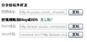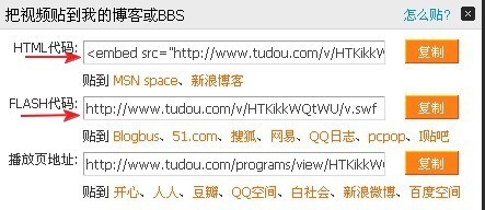 1、转发土豆网视频:打开土豆网的视频地址,点击“贴到博客或BBS”,就会出现如图界面