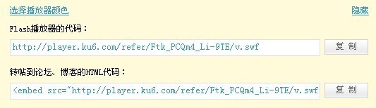 4、从酷6网中转发视频:打开酷6网的视频地址,点击,就会出现以下界面,和上述几个网站的操作方法一样,复制粘贴到我们的博客中,发表提交即可。