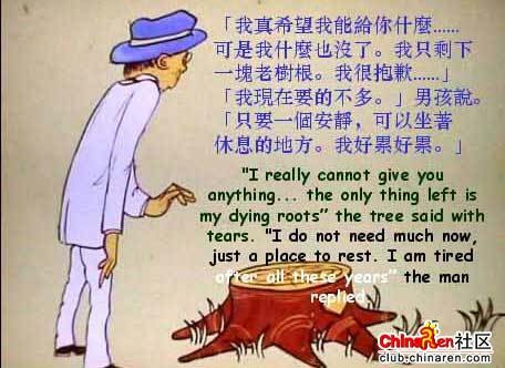 “我真的没有什么可以给你,只有我快要枯死的树根。”苹果树留着眼泪说。