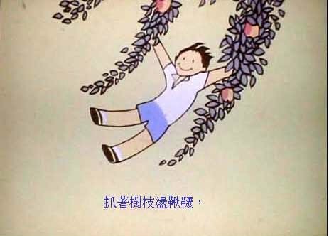 他上树摘苹果吃,在树荫里打盹,他爱这颗苹果树,苹果树也爱他。