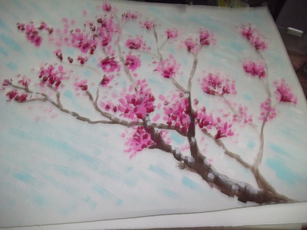 儿子已经很少时间做画了,11月17号,我带着儿子侄女一起去中关村图书大厦去看书,出来去了向阳文体用品商店,儿子说要买水粉和笔准备画画,买了几只水粉笔和水粉,11月18号周日在家,中午我在家做吃饺子,儿子在屋里画画,等我们做好饺子,我去叫他过来奶奶屋里吃饺子,到屋里一看儿子正在点花瓣,画了一张水粉画,拿过来和大家一起分享。