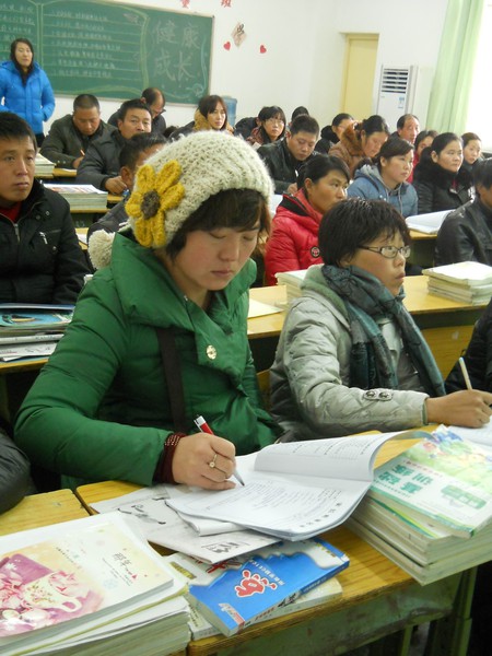 家长们在班里听家庭教育讲座