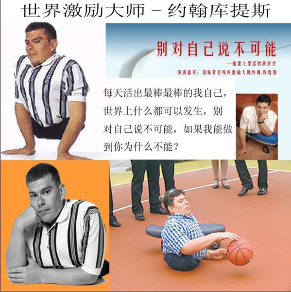 前段时间在学习视频课程的时候,再一次看到约翰*库提斯的典故,我很受启起和震撼,我决定把图片打印出来,再把他的那句:别对自己说不可能,一起打印下来。一张贴在办公室,时时提醒着我自己,一张贴在家里,可以勉励我的同时还可以让儿子感受一下来自于精神的力量。一回到家我就给儿子讲了他的故事,我们一起找来胶布把纸张贴在墙。还告诉儿子:一个没有双脚的人都可以成为大师,都可以成功,能做自己想做的事情,还可以帮助别人,那我们是一个健全的人,我也可以做到的,需要不断的努力。他可以,我们一样可以的。别对自己说不可能。在孩子遇到困难想放弃的时候,我会提醒他看一下墙上贴的图片。几日下来,他再遇到困难,便对自己说:别对自己说不可能,然后继续做。
