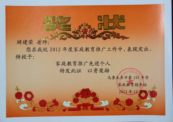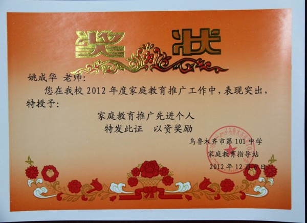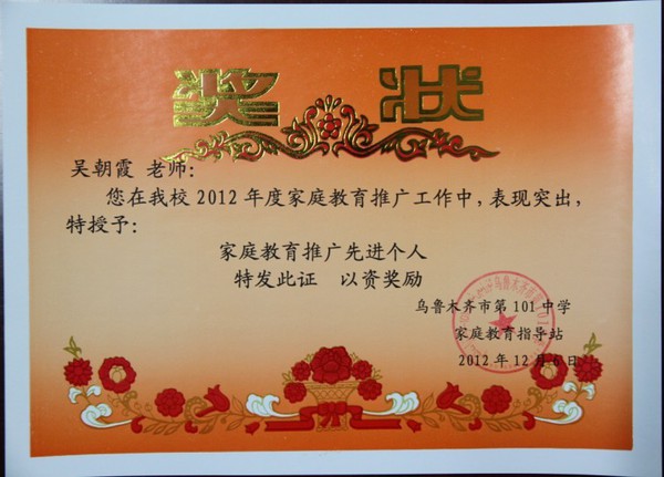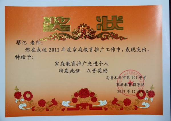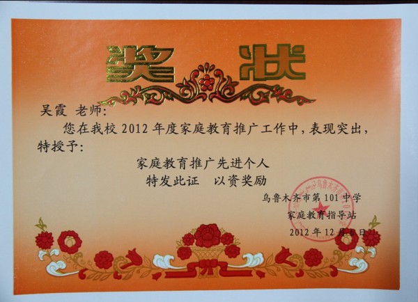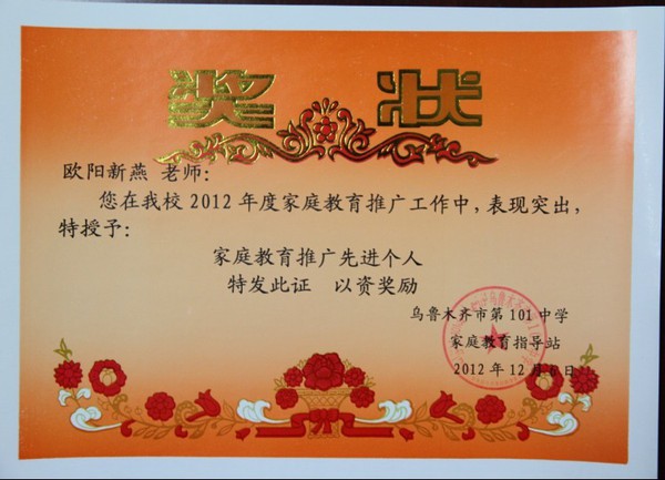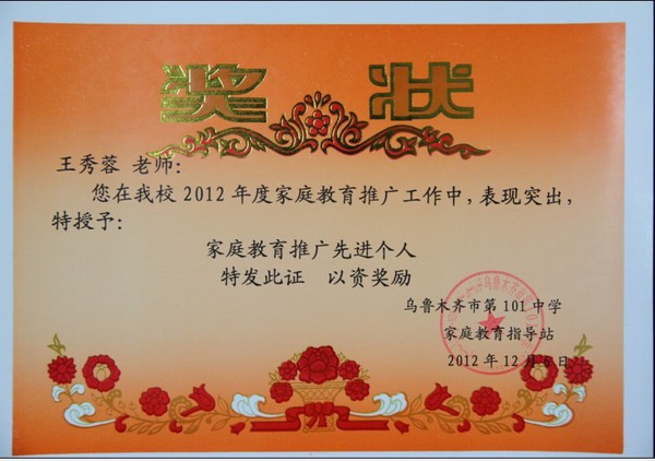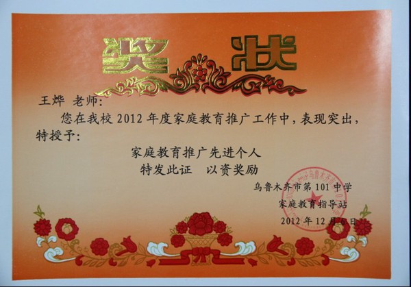 2012年3月在中华家庭教育研究院专家、米东区教育局领导及我校领导的关怀支持下,在班主任的大力配合下,我校的家庭教育工作成绩卓著。中华家庭教育研究院及其米东区教育局对我校家庭教育工作的全面、深入普及给予高度认可。我校的家庭教育工作使教师和家长的育人素养有很大提高、由于家长逐步意识到家庭教育是所有教育的基础,这使我校的育人压力在一定程度上得到缓解、教师有更多的精力投入教学工作中,真正实现了家校合理科学育人。