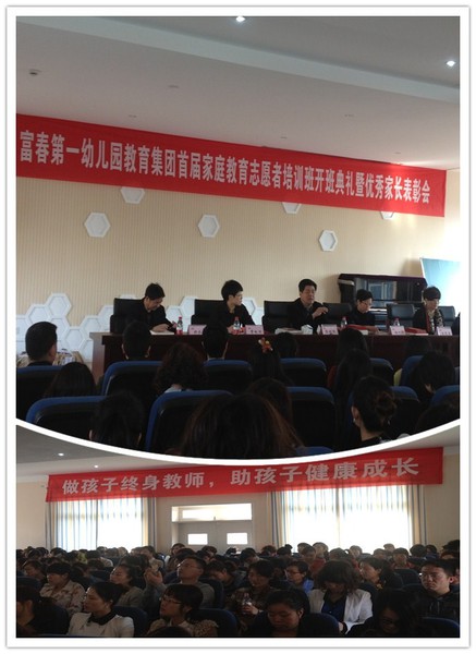 2013年3月9日上午9点,富阳市富春第一幼儿园教育集团首届家庭教育志愿者培训班在分园新桃源举行了开班典礼,168名老师和家长参加了培训。市教育局党委书记张树根,市妇联维权科长施一丹、街道妇联主席章林丽、教研室郑水泉书记到开班仪式祝贺并做了重要讲话。