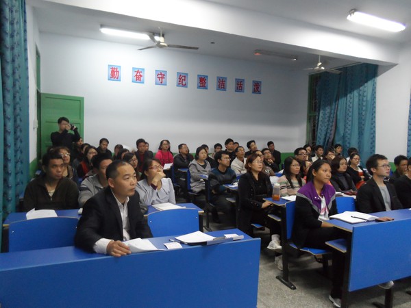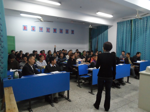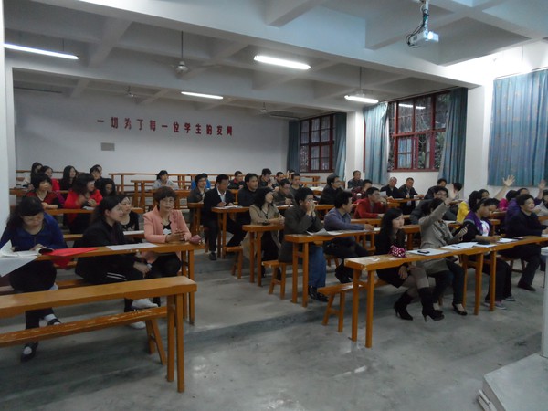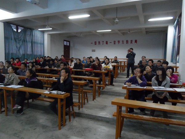 六点,吴校长就来到黄田八中,开始讲课。从药家鑫到汪九刀到李双江,一个个怂人听闻的话题引起老师们 一片嘻嘘声,老师们陷入了的思考——“天之骄子们到底怎么啦?”自然地引入人格的培养要靠家庭教育;第二部分,吴校长从学校压力的增大,到恶性事件警钟的不断敲响,引出为何要提升家庭教育素养,老师们听得越来越认真,记笔记的老师越来越多;讲到第三部分:怎样提升家庭教育素养的时候,精彩的实例分享让老师们如淋甘泉,以致吴校长刚讲完,就有老师要课件,要《不输》,吴校留下课件,耐心解答完毕,没顾上喝一口水,又匆忙赶赴临江中学,继续下一场讲座。看得我都心疼了。