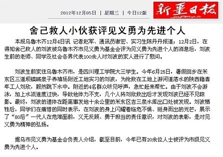 文/新疆都市报记者 姜岚 “有人落水,我一定会去救的” 24岁的刘波,是重庆理工大学大三学生,但他的花季人生永远定格在了今年6月25日那天。为了抢救溺水工友,他不幸落水身亡。如今,儿子的行为得到了肯定,48岁的陈学军多少有些安慰,但想起自己与儿子见的最后一面,她泪流满面。 “当时他奶奶去世,我着急赶回老家奔丧,他还特意将我送到机场,没有想到那就成了最后一别。”陈学军清楚地记得,当时在机场过安检的队伍很长,在排队的一个多小时里,儿子刘波就站在外面远远地望着她。当时,陈学军不知道为什么突然有些难过,次日,她就接到了刘波因救人意外身亡的消息。 而得知弟弟刘波去世,刘敏除了心痛不已,在她脑海中挥之不去的就是自己与弟弟在2010年的一次对话。 “姐姐你说,如果看到别人落水,我们救,还是不救?”刘波问姐姐刘敏。 刘敏回答:“我不知道,也不确定,看情况而定吧。”刘波听了,不是很满意,“如果见到有人落水,我一定会去救的,不会袖手旁观。一条鲜活的生命,如果不救,他的父母会心疼的。” 让刘敏没想到的是,一语成谶,弟弟为了救人献出了生命。 同伴得救 他却不见了 “刘波其实并不会游泳,但碍于同事间的情面,和两位同事去了离工地约1公里的渠道处。”刘波的父亲回忆。当时因家中有事,刘波向学校请了长假,并在父亲所在的乌市米东区三道坝镇碱泉子养殖区附近的一处工地上帮忙。6月25日,吃完午饭后,同事刘欣和李渊叫刘波一块去河边玩耍。不料,发生了意外。 刘波的父亲说,25日15时,外出办事的他突然接到李渊的电话,对方称:“刘波落水了。”他赶紧给在工地施工的工友杨师傅打了电话。等杨师傅和其他工友赶到现场,只见李渊正朝着渠道水流的方向边走边张望,刘欣则趴在岸边,但刘波没了踪影。后来消防部门赶来多方打捞,也没找到刘波。 7日19时许,时隔52个小时后,刘波的遗体在距离事发地十余公里的吉三泉水库出口处被发现。 对于刘波的离去,刘欣很内疚。他回忆说,水渠水深约1.7米,进入水渠后可能由于水温较低,他的腿抽筋了,便在水中挣扎。这时岸边的刘波伸出手来拉他,没有想到双双落入水中。 “是父母的骄傲,是社会的良心” “刘波是个热心肠的人。在我人生低谷时,他一直安慰我,鼓励我,现在我好了,他却不在了。”同学晓慧在得知刘波牺牲的消息后,非常难过。 “刘波在他人危难之时,义无反顾地伸出援手,把生的希望带给他人,把死的危险留给自己。他崇高的道德品质和无私的奉献精神是良好的家庭教育、学校教育、社会教育和自我教育的结果。他是父母的骄傲,是社会的良心。”刘波生前的母校乌鲁木齐101中学高校长为失去这样一个好学生深深痛惜。 在刘波牺牲后,米东区区委、区政府给予刘波的家人极大的关怀,乌市相关部门以及区政法委领导也为刘波申请见义勇为而积极奔波…… 最终,刘波的行为被乌鲁木齐市见义勇为基金会确认为见义勇为的行为,儿子刘波也被评为见义勇为先进个人。“孩子可以安心地走了。”陈学军说。 相关链接 《自治区见义勇为人员奖励和保护办法》从今年4月1日起开始正式施行。《办法》规定,见义勇为行为由县(市)社会管理综合治理机构组织确认。在自见义勇为行为发生之日起一年内提出,见义勇为行为本人或者其近亲属、有关单位和个人均可以向见义勇为行为发生地的县(市)社会管理综合治理机构申报、举荐,提交有关证明材料。 自治区将每两年表彰一次见义勇为行为。见义勇为事迹特别突出,在自治区范围内有较大影响的,将提请自治区人民政府授予荣誉称号,并给予不低于5万元的奖励;见义勇为事迹突出,在州、市(地)范围内有较大影响的,将提请州、市(地)人民政府(行政公署)授予荣誉称号,并给予不低于3万元的奖励;见义勇为事迹比较突出,在县(市)范围内有较大影响的,将提请县(市)人民政府授予荣誉称号,并给予不低于1万元的奖励。