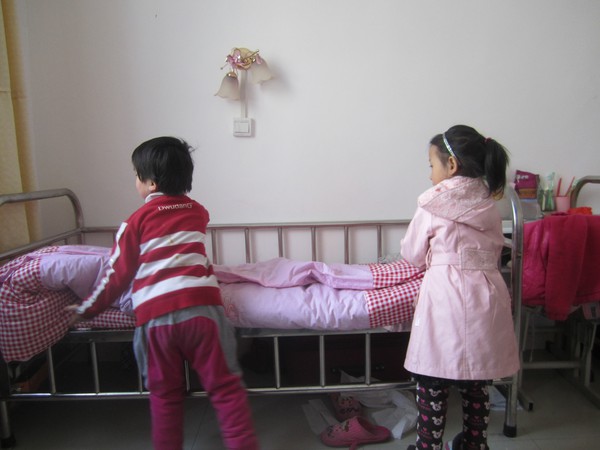 进了屋,一眼就看到小懒虫热爱拉的被子还没有叠,女儿开心立刻走上前去象个懂事的大姐姐一样帮热爱拉叠被子。看着她们相亲相爱的样子真是好幸福。遗憾的是18岁的大女儿不在,只能接6岁的热爱拉儿回来,同屋的古丽米拉羡慕地看着我们,于是热情地邀她一同前往,仨孩子立刻兴奋地欢呼雀跃起来,不等福利院的老师给她们穿好衣服,便迫不及待地往门外跑。