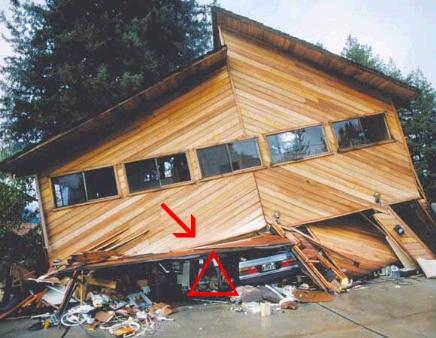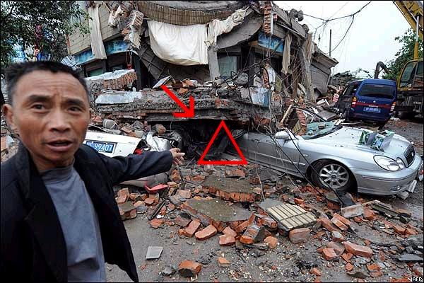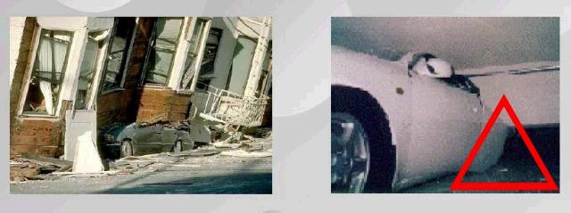 地震發生時如果你正好坐在車裡,馬上離開車內,坐下或躺在緊臨車子外邊的(三角)區域。如果有建築物等東西倒塌時,它會落在這個三角區以外的地方。如下所示