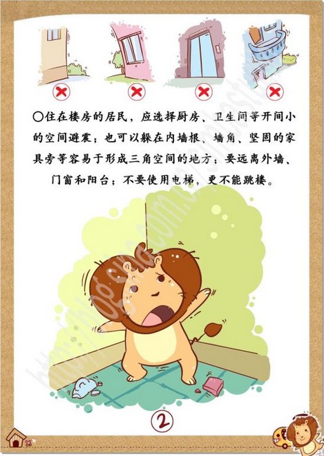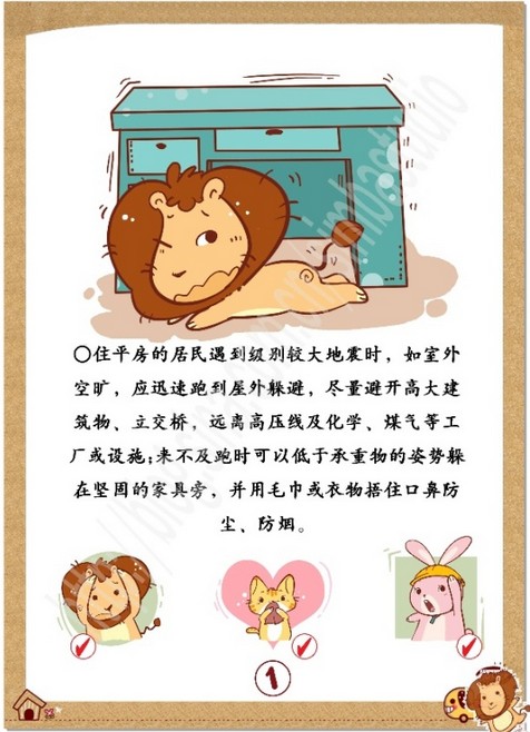 选择合适避震空间。室内较安全的避震空间有:承重墙墙根、墙角;有水管和暖气管道等处。屋内最不利避震的场所是:没有支撑物的床上;吊顶、吊灯下;周围无支撑的地板上;玻璃(包括镜子)和大窗户旁。