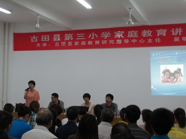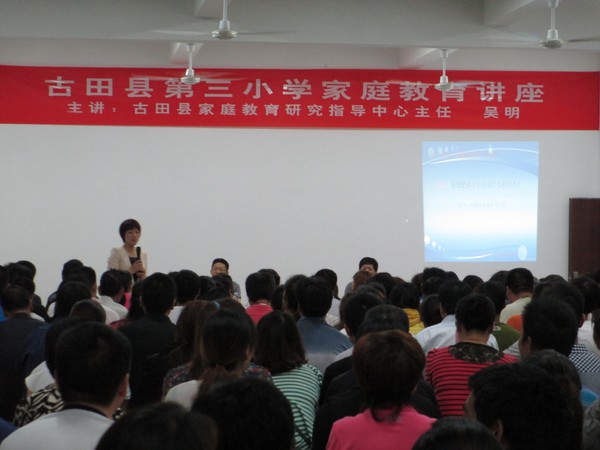 2013年5月14日19时,古田三小全体家长和老师聚集多功能教室聆听家庭教育讲座——《与孩子一同成长》。本次讲座由古田县学校家庭教育研究和指导中心的吴明主任主讲。讲座分成4个阶段,第一阶段改变观念;第二阶段树立榜样;第三阶段运用技巧;第四阶段加强学习。在整场讲座中,家长们听的聚精会神,不时掌声雷动。使家长意识到学习家庭教育知识和方法的重要意义,从而主动学习,和孩子一同成长。
