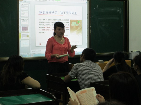 讲座结束后,我们回到了自己的班级中,图中的我正在为家长解读《不输在家庭教育上》。