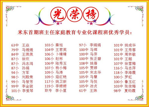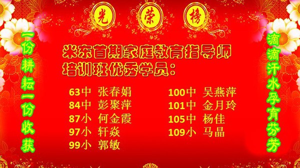 一分耕耘,一分收获,事实证明:通过这一年的学习,大部分老师意识到了家校结合的重大意义,他们认真学习专业课程,积极参与呱呱课堂视频交流,踊跃参加呱呱练兵活动,按时完成理论考核、个案以及说课(论文)。在实际工作中学以致用,成立家庭教育指导委员会,召开变革家长会,每月下发家庭教育指导菜单,组织家长学习《不输在家庭教育上》等活动。有的老师把自己学习家庭教育的心得体会、实践经验等发到了博客上,跟大家一起分享。 综合这些表现,在学习结业之际,中华家庭教育研究院和米东区教育局共同评选出优秀学员,特此公告,以资鼓励。