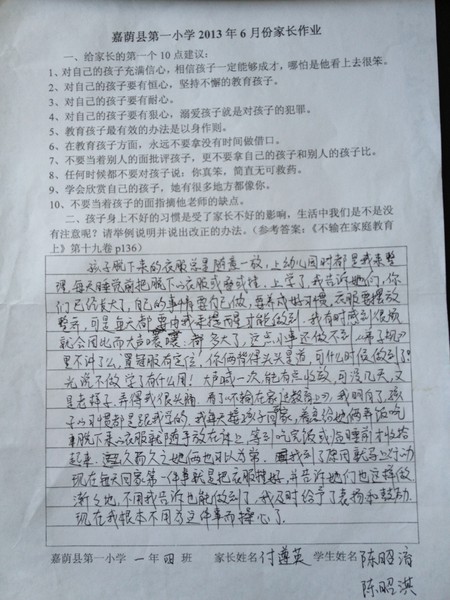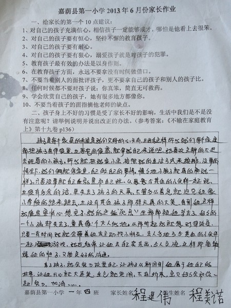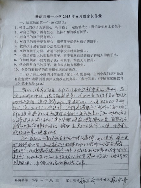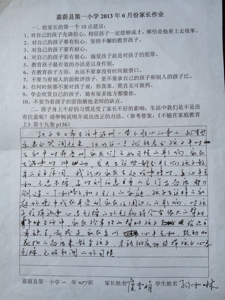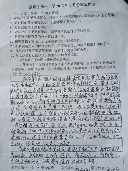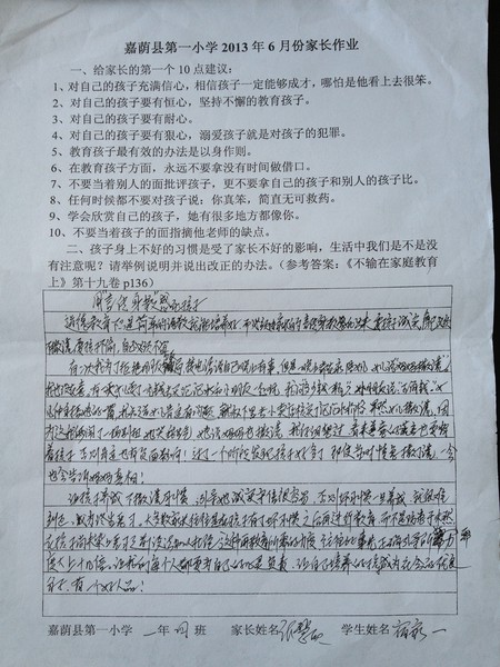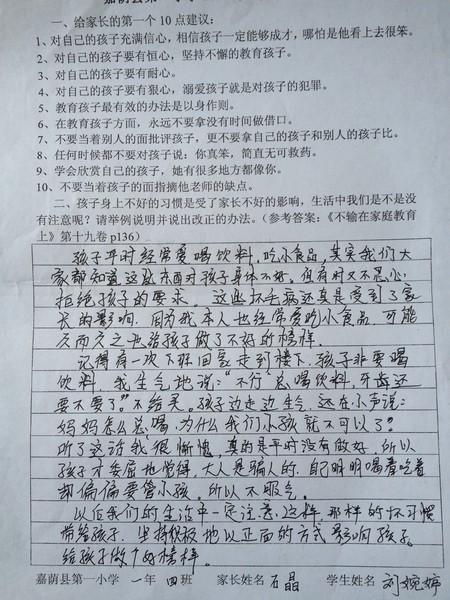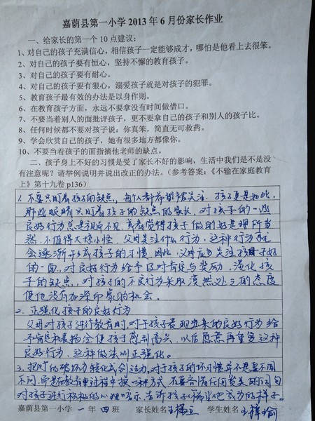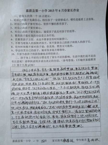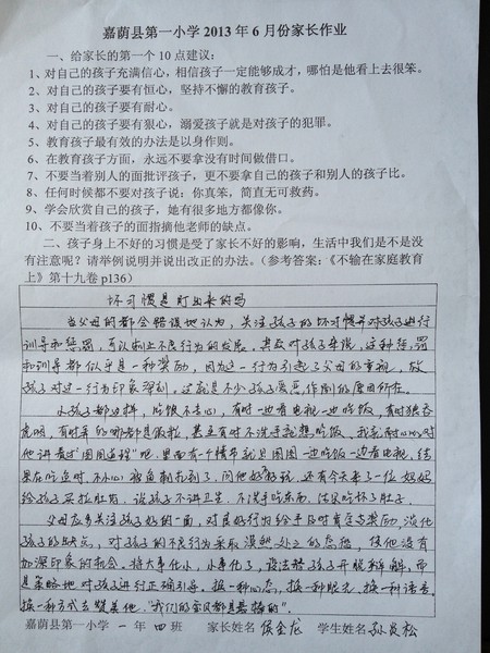 一年四班六月份优秀家长作业