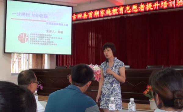 2013年8月11日,吴明团长及古田县家庭教育指导中心策划已久的古田首期家庭教育志愿者升班终于如期开班,并取得圆满成功。