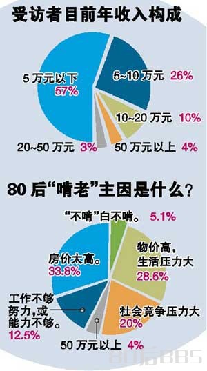 根据本报的调查结果显示,57%的80后年轻人,年薪收入在5万元以下,也就是说过半数的80后月收入低于4000元,在城市工薪族中属于偏低的水平。