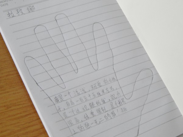 第一个活动:“我的手印”在愉悦的氛围中,我让大家在纸上画出自己的手印,相互观察,说出你的发现。有人说:“我发现大家手的长度宽度不同。”有人说“我发现大家的手长得都不一样。”我提问:“你们的观察都很细致,那么手印的不同最重要表现在哪里?”聪明的同学终于发现是每一双手的手纹不同。老师总结:我们每一个人都是世间独一无二的存在。