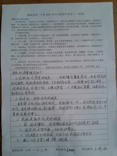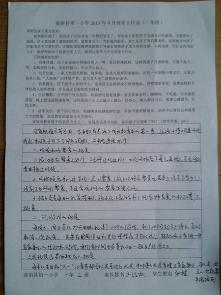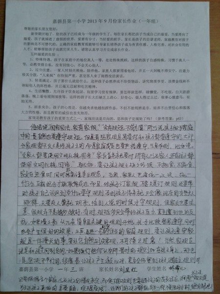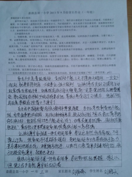 一年三班9月优秀家长作业