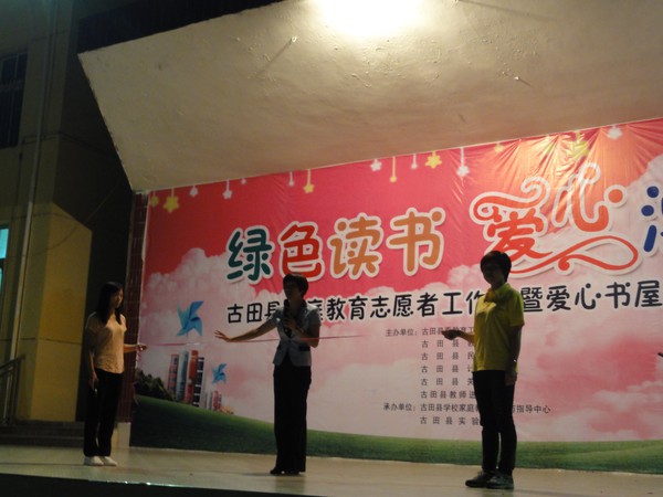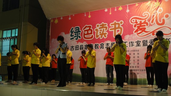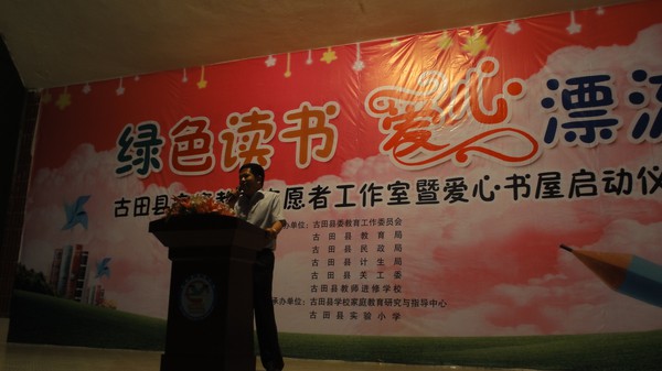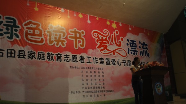 2013年10月12日“绿色读书,爱心漂流”--古田县家庭教育志愿者工作室暨“爱心书屋”启动仪式在实验小学顺利举行,参加此次启动仪式的有:福建教育学院官明辉副院长、古田县政府吴春芳副县长、古田县教育局李黄慧局长、民政局、计生局、老干局、计生协会、关工委、进修校、城关各中小学校长,幼儿园团长等领导;同时此次启动仪式还吸引了上千名的家长参与。
