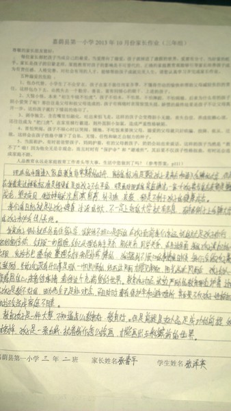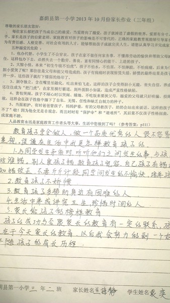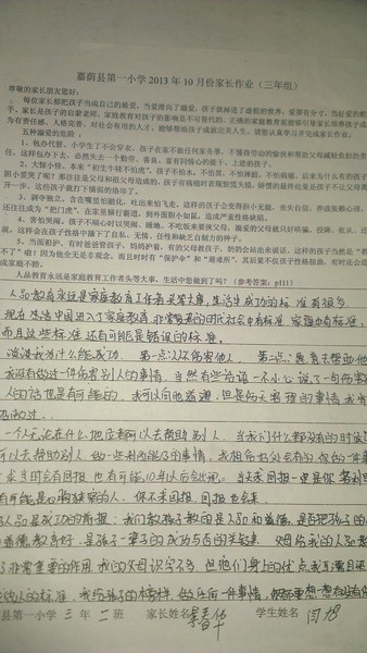 嘉荫一小三年二班10月份优秀家长作业