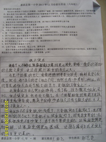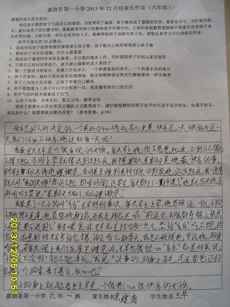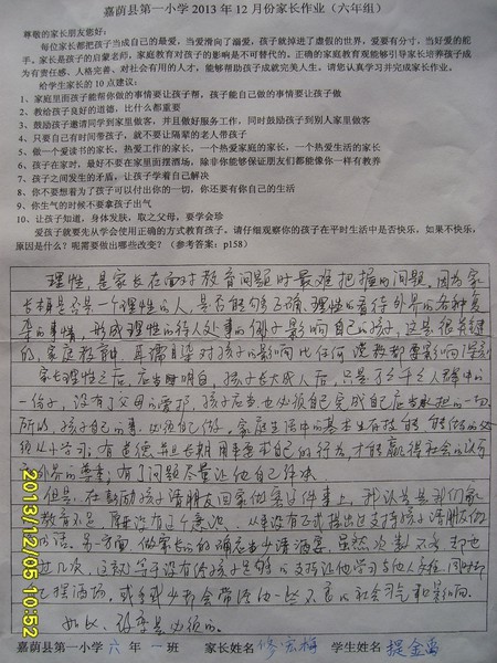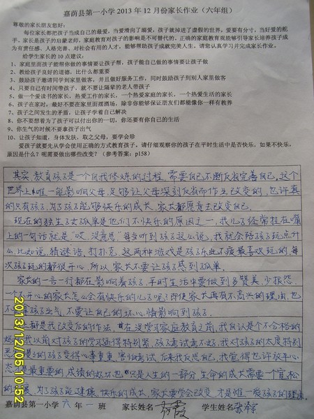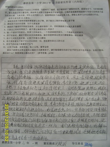 六年一班12月份优秀家长作业