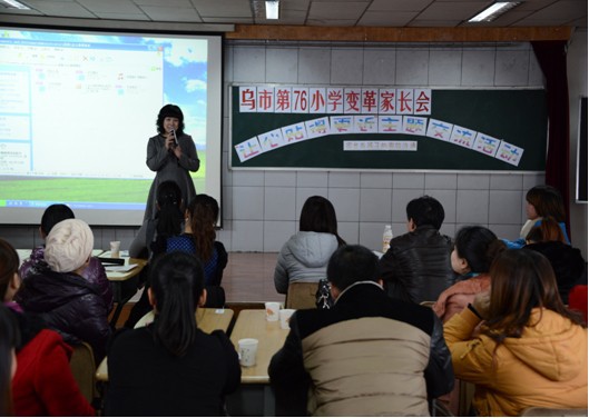 (乌市第76小学 程玉萍) 2013年12月6日, 我校邀请了中华家庭教育讲师团讲师吕红老师,第八小学德育主任张萌,第41小学德育主任、中华家庭教育讲师团高级讲师梁晓鸿,第54小学路易伟副校长,第77小学雷金泉书记,第32中学赵玲玲主任,八家户小学主任蒋福寿,还有各兄弟学校的老师及家长们,大家齐聚在第76小学,参加我校举办的变革家长会观摩活动。今天的变革家长会由我校五年级一班承接,主题是“让心贴的的更近”——家长与孩子的有效交流沟通。本次变革家长会意在指导家长们在与孩子的交流沟通上有所收获,目的是引导家长采用积极有效的沟通模式,促进家长与孩子的亲子关系,培养孩子健康积极的心态,不断提高我校家长的家庭教育素养。家长会采用家长定主题,家长主持,家长相互交流等形式,首先用一段动画片《大耳朵图图》中关于理发的故事引入主题,让家长意识到与孩子的交流是教育好孩子的前提;接着家长们观看了由五年级一班的学生编排的小品《拿到试卷后》,引起家长的思考:应该采用什么样的方式与孩子交流,才是有效的?又用一个爸爸教育女儿的方式的小故事,引导家长与孩子进行有效的交流的内容。家长之间做了交流,聘请的41小德育主任梁晓鸿、8小的德育主任张萌做为嘉宾,给家长们提出了指导性的建议。嘉宾指出我们作为家长,要平等对待孩子,尊重孩子的自主性、独立性,同时也要在物质上、精神上全面关心帮助孩子,善于赏识孩子,并且严而有度。与会的家长听后获益颇多。最后用才艺展示,写心里话卡片的形式,让孩子与家长进行了一次心与心得交流。家长们感受很深,好多妈妈都留下了感动的泪水,通过这种交流,增进了孩子与家长的情感。家长会在感动中圆满结束并由吕红老师提出宝贵的建议。