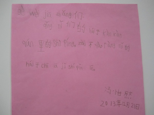 看完视频后,女儿跳下床,把她所有喜爱的垃圾食品统统扔到了垃圾桶里,接着又跑到书桌前奋笔急书。我上前问她在做什么,她说她要给班里66个孩子的家长们各写一封倡议信,即使晚上不睡觉也要写完这66封信。她要告诉班里的家长,坚决不要再让孩子吃垃圾食品了。我建议她用心写一封信,然后帮她拍了照片发到群里,这样班里的家长都能看到倡议信。女儿答应了,写完信后,她依然难以平静,又接着写了一篇日记,记述了自己的感受,在日记中她再次提议小朋友们都不要再吃垃圾食品了。