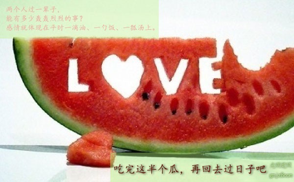 星期六,我独自回到父母家。他们一见我就问:“怎么一星期没见到徐蔓了?”我就把我们闹别扭的事原原本本地说了。妈妈一听就责备我,做事不该只顾自己而不顾别人。我不以为然:“不就是吃了半个西瓜嘛,有什么大不了的?”爸爸笑了:“你也不用替自己辩解。明天是星期天,你们都过来一趟。”第二天,我和徐蔓带上孩子回到父母家。一进门,爸爸就支使我出去买醋。等我买了回来,爸爸说徐蔓带着孩子出去了。说完他就抱出半个西瓜给我:“看你热得一头汗,吃点西瓜解解渴吧。”那半个西瓜足有四五斤,爸爸递过来一个勺子:“吃不了就剩着,让你媳妇回来吃。”我接过勺子大吃起来,吃了不到一半,肚子已经胀了。
