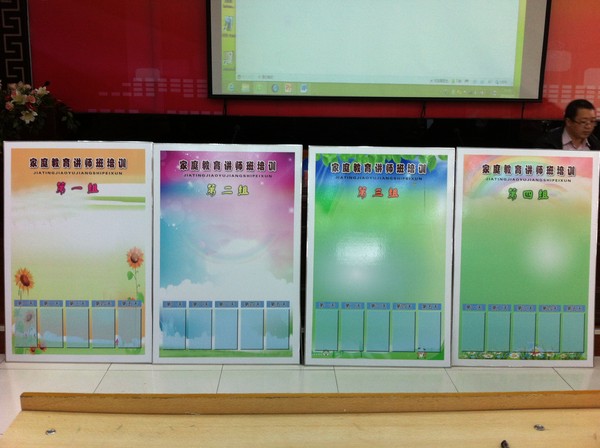 展板是给学员在培训课程中随时分享心得准备的小小平台。把这个小小平台做成这样,可见准备这项工作时的真情投入。后来知道这是关工委的吴红宇主任在做。我们还看到学员报到时志愿者的有序工作,整洁的座椅靠背上贴好了的学员姓名,大教室的讲台上是刚刚拆封的新电脑,音响、话筒都已经调试到最好状态,宽大的窗台上排放着一列还没有摘下商店标牌的热水瓶……路边的柳树才刚刚展开一点点绿意,可是家庭教育让在这里的人们如此温暖!