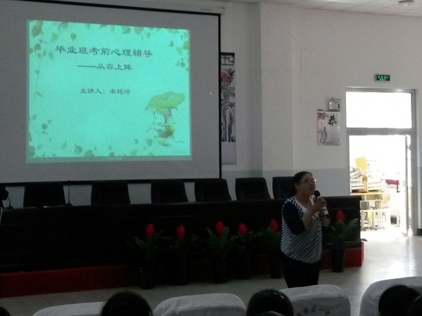 中考临近,为了进一步提高学生的应考素质,提高学生的学习效率,让他们放下包袱,轻装上阵,以良好的心态备战中考,校德育处特安排心理咨询老师于2014年5月14为九年级举办《毕业班考前心理辅导——从容上阵》的讲座,九年级近1000名学生与特邀家长以及班主任老师倾听了讲座。