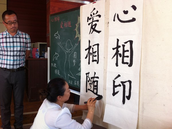 在优美的诗歌朗诵声中“圆梦队”同时表演书法——浓墨挥洒出他们的队呼:心相印爱相随!