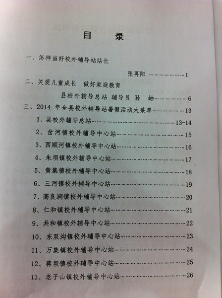 会议材料目录——各乡镇辅导站都已经做好了暑假工作的安排,假期活动结合家庭教育、社会教育,为学校教育争取更广泛的合作和支持。