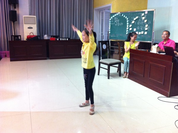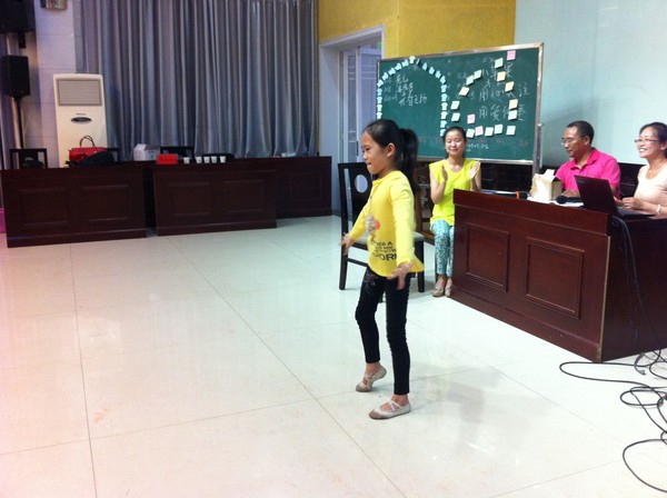 今天下午的才艺展示,这个可爱的小姑娘参加了她妈妈所在小组的家庭情景剧的表演(左一坐者),给剧中的爸爸送上了节日礼物,还为这个爸爸表演了舞蹈“小苹果”——结束的时候,学员们和她打招呼就都称呼她“小苹果”了……