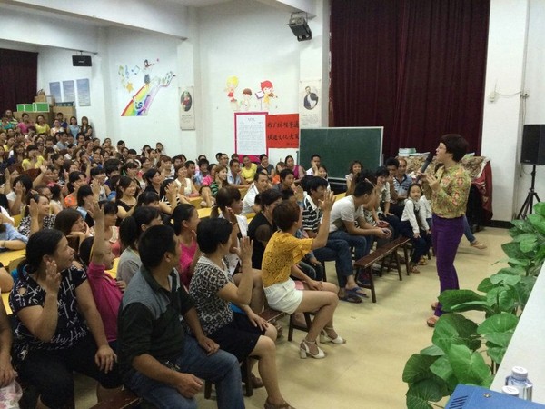 晚六点半同时在鹤塘小学多媒体教室,家庭教育讲师、家庭教育指导师龙华为一二年级家长讲《如何帮助孩子养成良好的习惯》。图为家长积极互动中