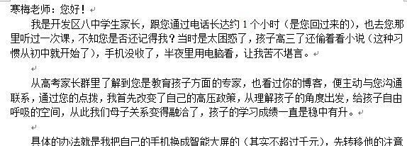 今晨我在整理文件时,看到群里的家长发给我的信件,放下手里的工作,第一时间打开,因为尊重别人就是尊重自己。我认真拜读感悟着多遍家长发自肺腑的心声,我的心情久久不能平静——为家长成长感到高兴的同时更为家长字里行间真诚反馈给我的那份真诚之心感动着...... 家长进步一点点,我都会“欣喜若狂”,好似喝了蜜一样甜在心里,喜在心间。因为好的关系才有好的教育。