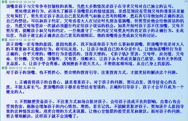 顶嘴是孩子与父母争夺控制权的表现,当然大多数情况是孩子在寻求父母对自己独立的认可。要处理这种行为,必须先了解孩子顶嘴背后的情绪原因,是感觉到没有受到父母的尊重还是被父母冤枉了,要先肯定孩子表达自己意见的勇气和独立思考的精神,然后再引导他如何正确的表达自己的想法。可以和孩子约定,父母或者大人在讨论时先别急着插嘴,但要答应他会给他说话的机会,当然父母每答应一次就必须履行约定给孩子说话的机会。如果开始时孩子忍不住顶嘴,父母不要斥责,提醒孩子和父母的约定,一旦他遵守了一次约定父母要及时的肯定孩子的正确行为。长此以往,当孩子建立起正确表达自己意见的规则后,他的顶嘴将会变成和父母的讨论。