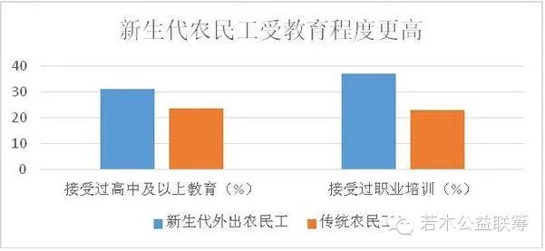 据国家统计局数据,2009年,在新生代外出农民工中接受过高中及以上教育的比例,21-25岁之间的达到31.1%,高出传统农民工总体平均水平7.6个百分点。而2008年进行的第二次全国农业普查数据显示,新生代农民工中接受过职业培训的人员比例达到36.9%,高出传统农民工14个百分点。这使得他们更容易胜任那些需要更高教育水平和培训程度的工作。