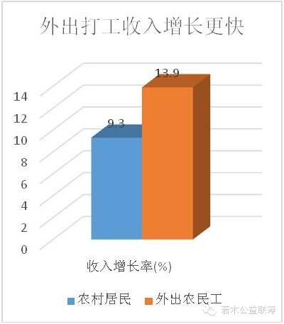 假设明哥住在马兰坡村,他的情况代表我国农村居民平均水平。[2]根据国家统计局的数据,如果明哥2013年留在马兰坡家里,他个人的年纯收入为 8895.9元,扣除价格因素实际比上年增长9.3%,也就是说他每月收入741元。而[3]如果明哥2013年选择出门打工,他的月收入将是(不包括包吃包住)2609元,比上年增长13.9%。这么简单一比较,明哥外出打工平均每月赚的钱是他在老家做农民赚的钱的3.52倍!什么,你说城市消费高?那我们再算上人均月生活消费支出892元,明哥外出打工每月可以节余1717元。相比之下,如果明哥留在老家,即使每月一分钱都不花,一个月也只能存下741元。