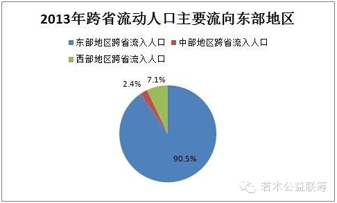 首先我们看看人口是怎么流动的,根据[1]国家卫计委这个月刚刚发布的消息,2013年东部沿海地区跨省流入人口所占比例为90.5%;西部地区为7.1%;中部地区为2.4%。