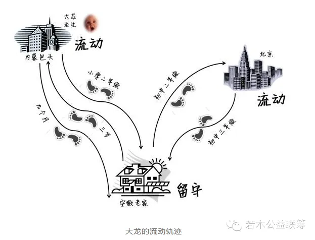 举个真实的例子:大龙的父母在九零年代初从安徽到内蒙古打工,他和妹妹出生在包头。大龙九个月大的时候,被爷爷奶奶带回安徽老家。到三岁时又被带回包头, 读书到小学二年级,又从包头回到了安徽老家读小学。大龙的父母在2001年离开包头到北京工作,与父母分离后的大龙,回老家这么一待,就念到了初二。 2008年春节过后,又被父母接到北京上初中二年级。大龙妈妈说,如果之后不能在北京考高中的话,初三下打算再让他回安徽去读书。