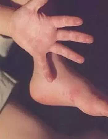 急性起病,发热,口腔粘膜出现散在疱疹,手、足和臀部出现斑丘疹、疱疹,疱疹周围可有炎性红晕,疱内液体较少。可伴有咳嗽、流涕、食欲不振等症状。部分病例仅表现为皮疹或疱疹性咽峡炎。多在一周内痊愈,预后良好。部分病例皮疹表现不典型,如:单一部位或仅表现为斑丘疹。