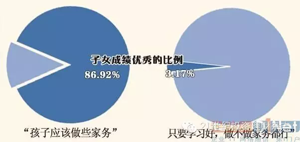 但是大数据结果却告诉我们,自主管理能力高的小学生学业水平也更高。有意思的是,在孩子专门负责一两项家务活的家庭里,孩子成绩优秀的比例也相对较高。认为“只要学习好,做不做家务都行”的家庭中,子女成绩优秀的比例仅为3.17%,而认为“孩子应该做些家务”的家庭中,子女成绩优秀的比例为86.92%,两者相差悬殊。