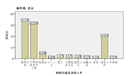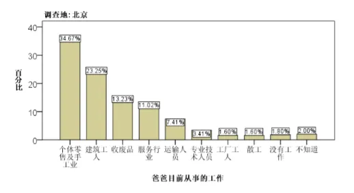 比如一些外企的白领甚至金领子女都没有北京户口,包括中央电视台的记者中,都是没有北京户口的“新闻民工”,不过他们虽然没有户口,但有一定的经济条件和社会关系,通 过交赞助费或者托关系基本上可以享受到较为合格的教育,他们决不会把自己的孩子送进民 营的打工子弟学校,这些孩子也是被教委口径统计为打工子弟的一群。而在北京上民营打工 子弟学校的孩子,则是这样一种家庭背景。据笔者研究团队 2009 年的调查,父母职业如下: 基本上主要是小工商业,建筑工和低端服务业,包括做家政服务。