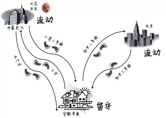 举个真实的例子:大龙的父母在九零年代初从安徽到内蒙古打工,他和妹妹出生在包头。大龙九个月大的时候,被爷爷奶奶带回安徽老家。到三岁时又被带回包头,读书到小学二年级,又从包头回到了安徽老家读小学。大龙的父母在2001年离开包头到北京工作,与父母分离后的大龙,回老家这么一待,就念到了初二。2008年春节过后,又被父母接到北京上初中二年级。大龙妈妈说,如果之后不能在北京考高中的话,初三下打算再让他回安徽去读书。
