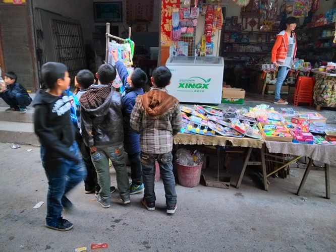 北京的某个城边村,父母在自家店门口一边工作、一边陪着孩子写作业