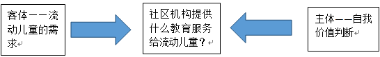让我们回到问题本身,“社区机构能够为流动儿童提供哪些教育服务?”,这个问题涉及到两个对象——“社区机构和流动儿童”,我们不妨就从这两个方向去思考,把流动儿童的需求作为客体,社区机构的自我价值作为主体,来进行判断。